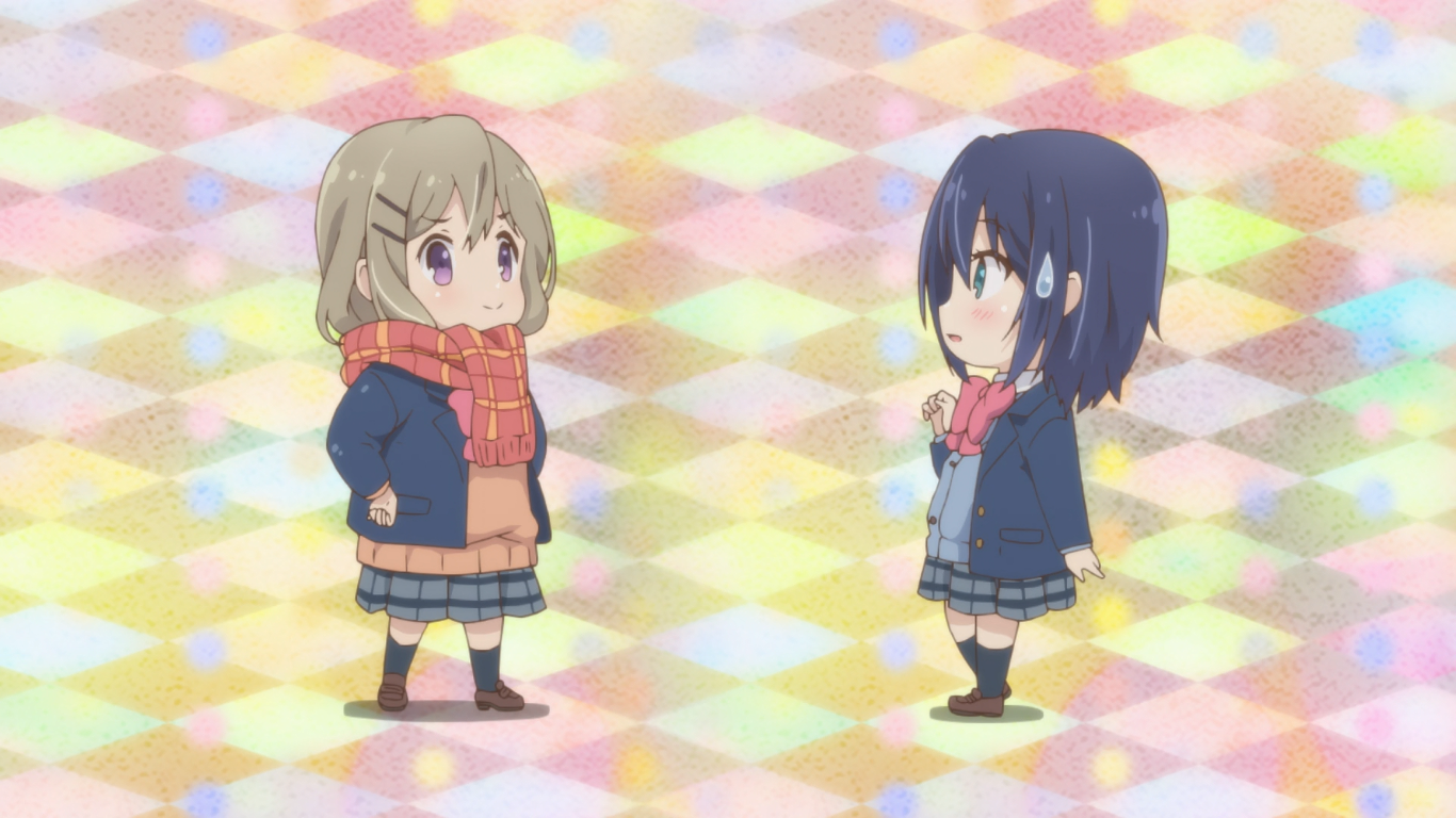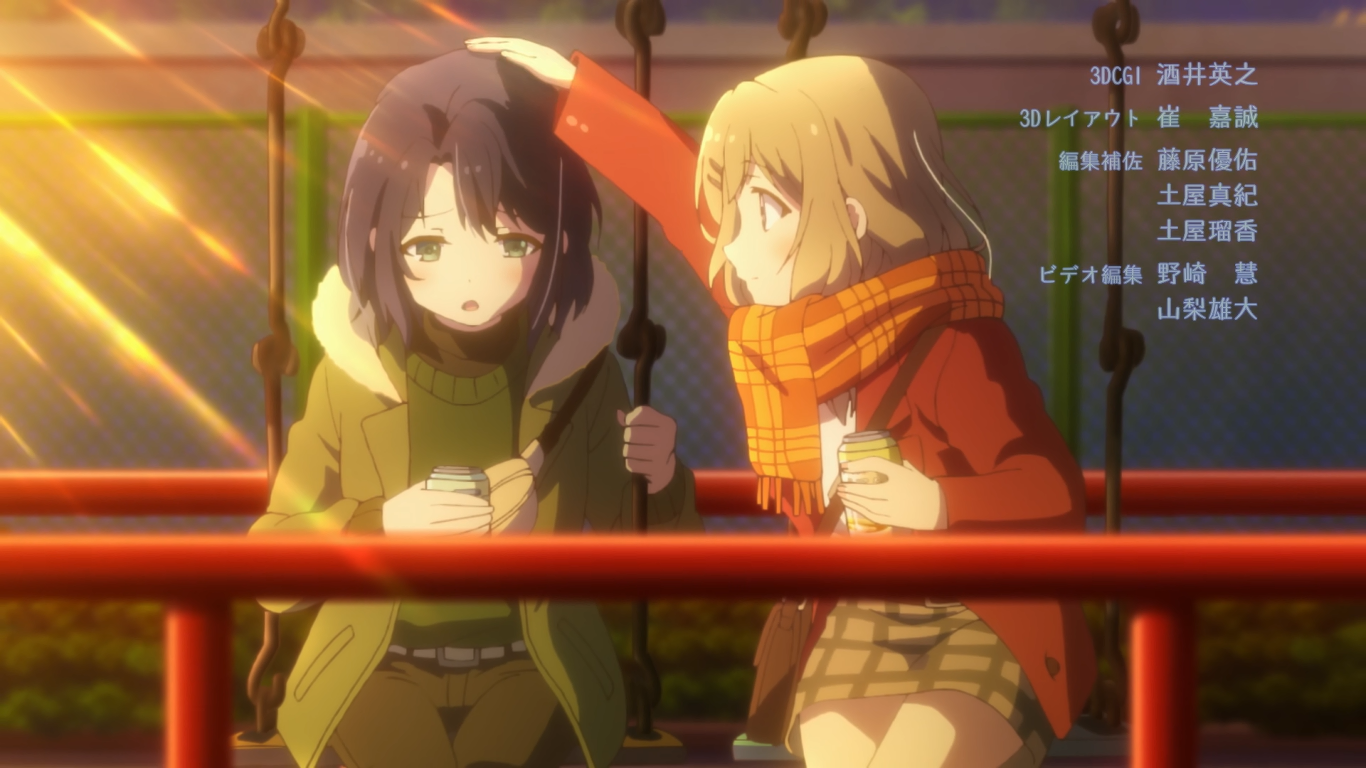 By the time Episode 5 rolls around, Christmas is right ’round the corner! And ever since she was little, Adachi has not known what it’s truly like to have a Merry one. Because every time she’s been out on the 25th of December, she has seen sights of couples walking, snuggled up to each other; of children running, enveloped in the joy all around and of parents chasing after them, trying albeit never truly wishing, to tame their wonder. Adachi has never had any of those things. But this year, she is determined to feel just like that. To be happy like everyone else. And the only way she knows to be this happy is to be with the one person whose very name makes her feel a warmth inside her chest. But of course, this whole scenario has one minor flaw. She would actually have to muster up the courage to ask Shimamura out to be with her. And for her, that is no small task. For most of the episode, Adachi spends her time staring at her like a lost kitten but eventually gathers the strength to ask her out to spend the day together. Adachi’s approach at first takes Shimamura by surprise – “Why would she choose to ask me out like that?” Shimamura thinks to herself (Clue: SHE LIKES YOU, GENIUS). But when Adachi reveals that it’s because she didn’t want to spend another Christmas by herself, Shimamura assumes that it’s simply that Adachi just wanted to be with someone. Anyone would have sufficed. And so unburdened by the pressure of living up to be her ‘special someone’, she says yes.
