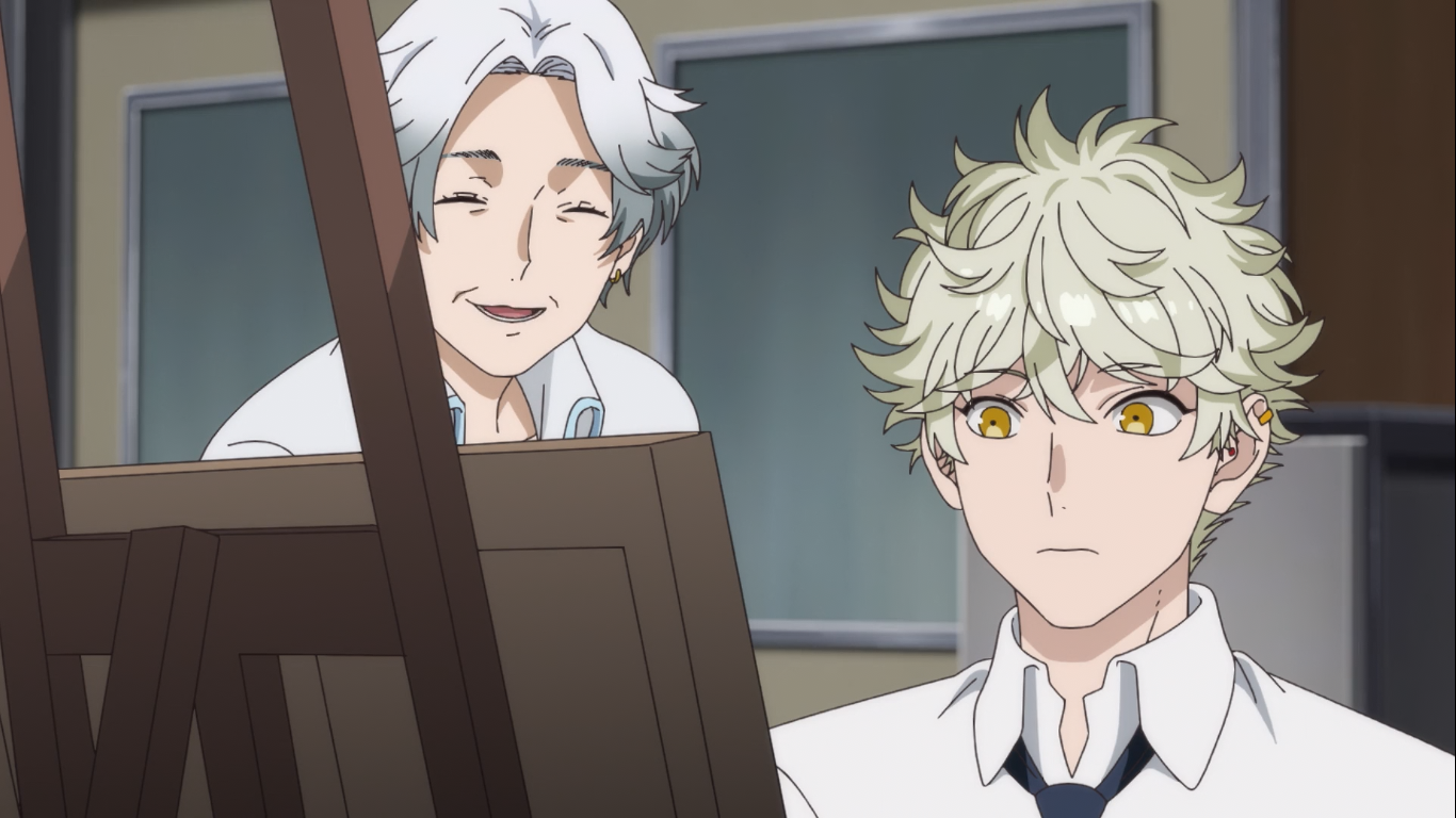 The first and the obvious one of these being sound. While we get to hear the background score for Blue Period only for about a fifth of the episode’s runtime, its lush and gentle undertones complement each such scene perfectly while never taking center stage. The sound director, Hiromi Kikuta, really understands the kind of melodies that should permeate this world and brings them to life delectably. And yet, the real star of the show here has to be the simply outstanding VA work that the entire cast is pulling off. Every single character, even if they may have only a single line of dialogue commits to the role they’ve been given. There’s no exaggeration and all the emotions are conveyed with the most naturalistic delivery possible. It’s especially the scenes carrying heavy emotional weight like the ones between Yatora and his mother and the simply stunning voice break that Ryuuji’s voice actor pulls off in the scene when Mori-senpai is being congratulated, revealing the natural depth of his masculine voice which he subconsciously tries to keep veiled behind his chosen femininity, which are for me a marked improvement over the manga.