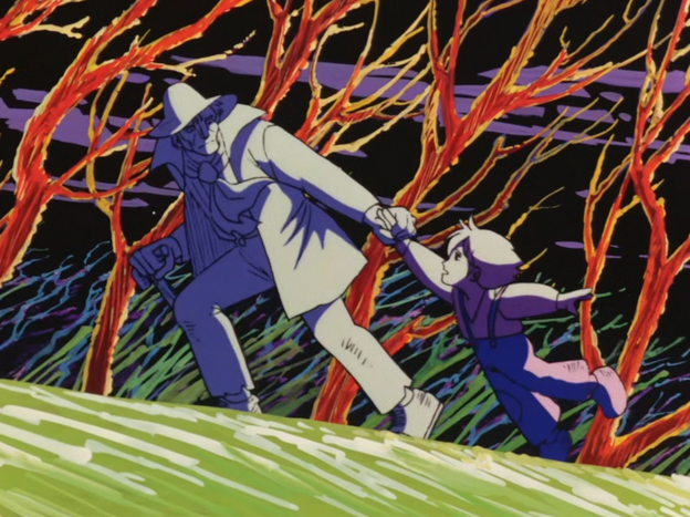 But the anime has a unique style all its own when it decides to go all-out with surrealist imagery and psychedelica, usually used to show how a child Remi’s age views a world that he has no frame of reference for. Colors are more vivid, dangers look more menacing, and strange things are downright creepy. Speaking of the backgrounds (Courtesy of art director Shichiro Kobayashi of Angel’s Egg, Utena, and 90s Berserk fame. Yes, really), the layered backgrounds aren’t just to give Remi its unique look, as I recently learned that Remi was actually the first and only anime series made to be viewed in 3D. But not the type of 3D you’re thinking of with the red and blue 3D glasses. There’s this concept called the Pulfrich effect, a weird optical illusion involving the different processing times between both eyes, induced by dimming one eye, resulting in anything that moves horizontally given the illusion of depth, which is why the multi-plane animation is used. Copies ordered from the MediaOCD website contain specialized 3D glasses that you can wear and see this in effect, if you want. Not sure if I recommend watching the entire series like this.