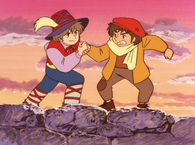 Speaking of the characters, let’s talk about them! Remi as a series has no shortage of characters to follow, even if the main cast is relatively small, especially for a 51-episode series. If you ask me, all of them are wonderfully well-written and developed, constantly evolving as the show goes on, and are consistently engaging throughout. Even characters you don’t expect to receive much in the way of personality, such as Vitalis’ dogs, are given unique strengths and flaws that are used wonderfully. One example of this is Zerbino, a dog who steals food on a regular basis. His actions create a lot of tension throughout the series, and it forces Remi, Capi, and Vitalis to really develop and grow up when trying to deal with him. Not to mention that Zerbino’s gluttony results in a pretty significant event, which I won’t spoil. Remi himself starts out as a naive, sheltered 8-year-old dealt a bad hand, and in my opinion, his growth and development is easily the best part of the series. We get to see Remi grow and mature into a more responsible, well-rounded person thanks to Vitalis and all the people he encounters throughout his life, even when things are at their bleakest. It’s especially noticeable when you compare how he was with Vitalis in the first series to his interactions with the street urchin Mattia, who joins him in the second half. Actually, one big change the anime made compared to the novel is Mattia’s characterization. In the book, Mattia was a more passive, weak-willed character, and the anime decided to completely change his characterization, making him more of a scrappy, sassy, intelligent Artful Dodger-type kid. I haven’t read the novel yet, but I do think this was a good move, as Mattia’s different personality from Remi allows them to have a fun dynamic and stronger chemistry with one another.