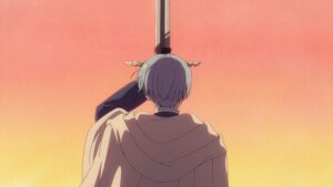 There are plenty of reasons to be grateful for Frieren’s return, but number one on my personal list is its background art. Even when the story travels to places that don’t interest me (for example, the city in episode 2 where the gang is forcibly recruited for a demon hunt), I’m never disappointed in the show’s world. Studio Wyeth’s mastery at depicting the natural world is obvious, but they’re just as proficient at the manmade stuff – for example, the stonebuilt dining hall where Graf Dach commissions Frieren’s party to retrieve his family heirloom. Despite being largely brown, the texture of the rocks and their variable sizes give the scene plenty of visual interest, along with a grandeur that humorously contrasts with Frieren’s disappointment at her orders. Transitions between Frieren’s memories and her present adventures are made seamless by matching times of day, especially the deep sunsets of episode 2’s battle scene (followed by Himmel’s past retrieval of the same sword that Frieren saves) and 3’s arrival at a hidden hot spring. In some other reality, a slow, only partially action-driven series like this might not have been granted such fabulous production values – thank goodness we live in this and not some other timeline.