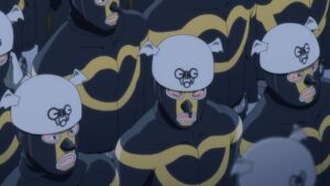 This mini-arc marks Belve Squad’s first successful mission, or more accurately, Isobe’s, since he scaled Tokyo Tower solo after his subordinates had gone home for the night. (Who’d have thought that taking down one of Japan’s most famous landmarks would be as simple as unscrewing the aircraft warning light at its apex?) Ganglion made sure to position Isobe’s success separately from the usual Hopeman farce, linking it instead to his desire to impress his son. In fact, families in general were addressed in the last of these three episodes – the narrator tells us that without a TV signal (which Tokyo Tower still provided to the surrounding area when the Ganglion manga was written), “the sound of families laughing echoed across Japan” that night. Episode 18 was also presented in a traditional 4:3 aspect ratio to match the low tech status quo ushered in by Isobe’s sabotage. I’m always tickled whenever a TV show comments on the harm done by television, or how society would benefit from its absence, and this was no exception. Maybe the Ganglion organization’s future successes will have similarly positive side effects – we’ve got just six more episodes (totaling fewer than 20 minutes) to find out.